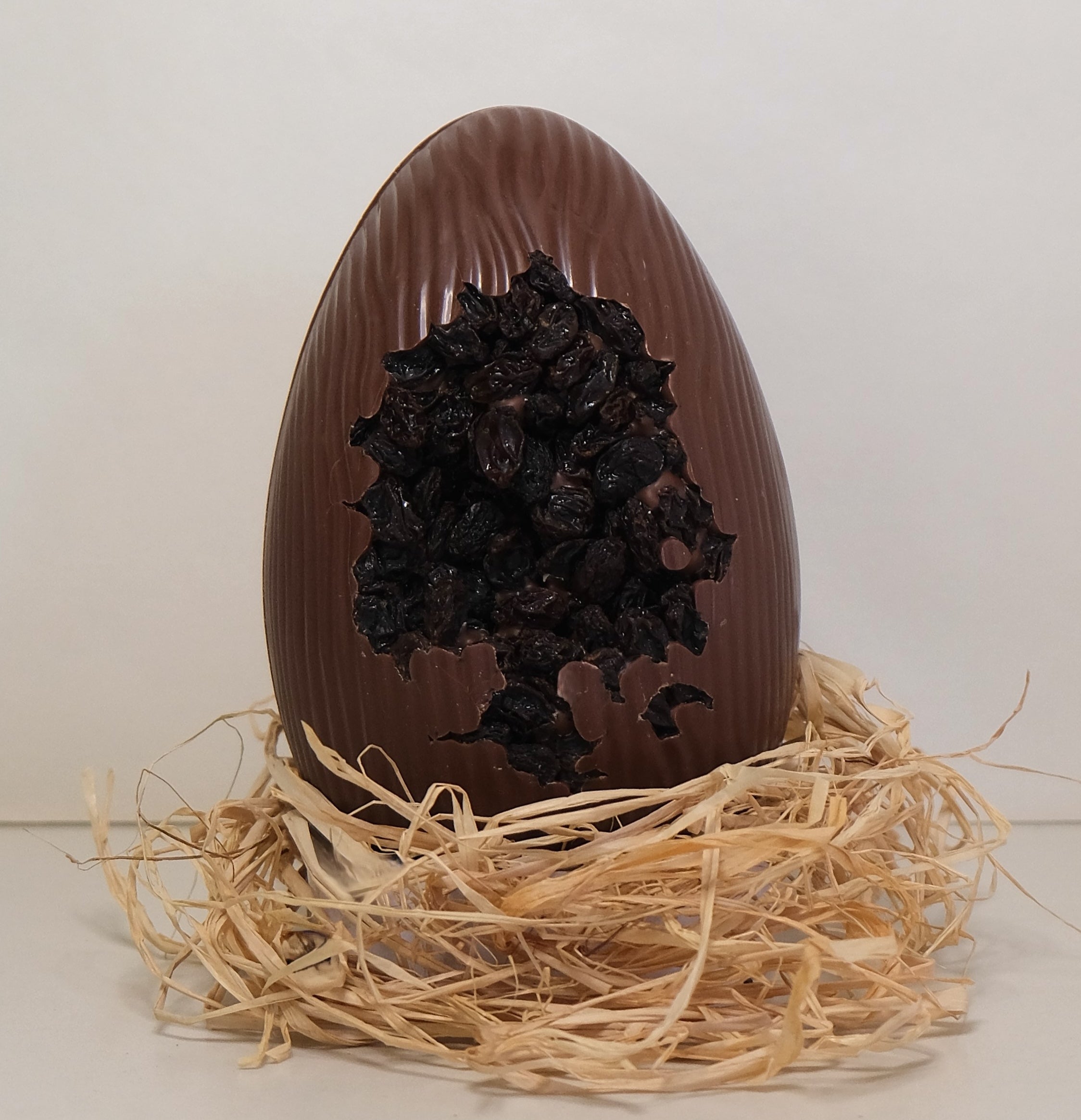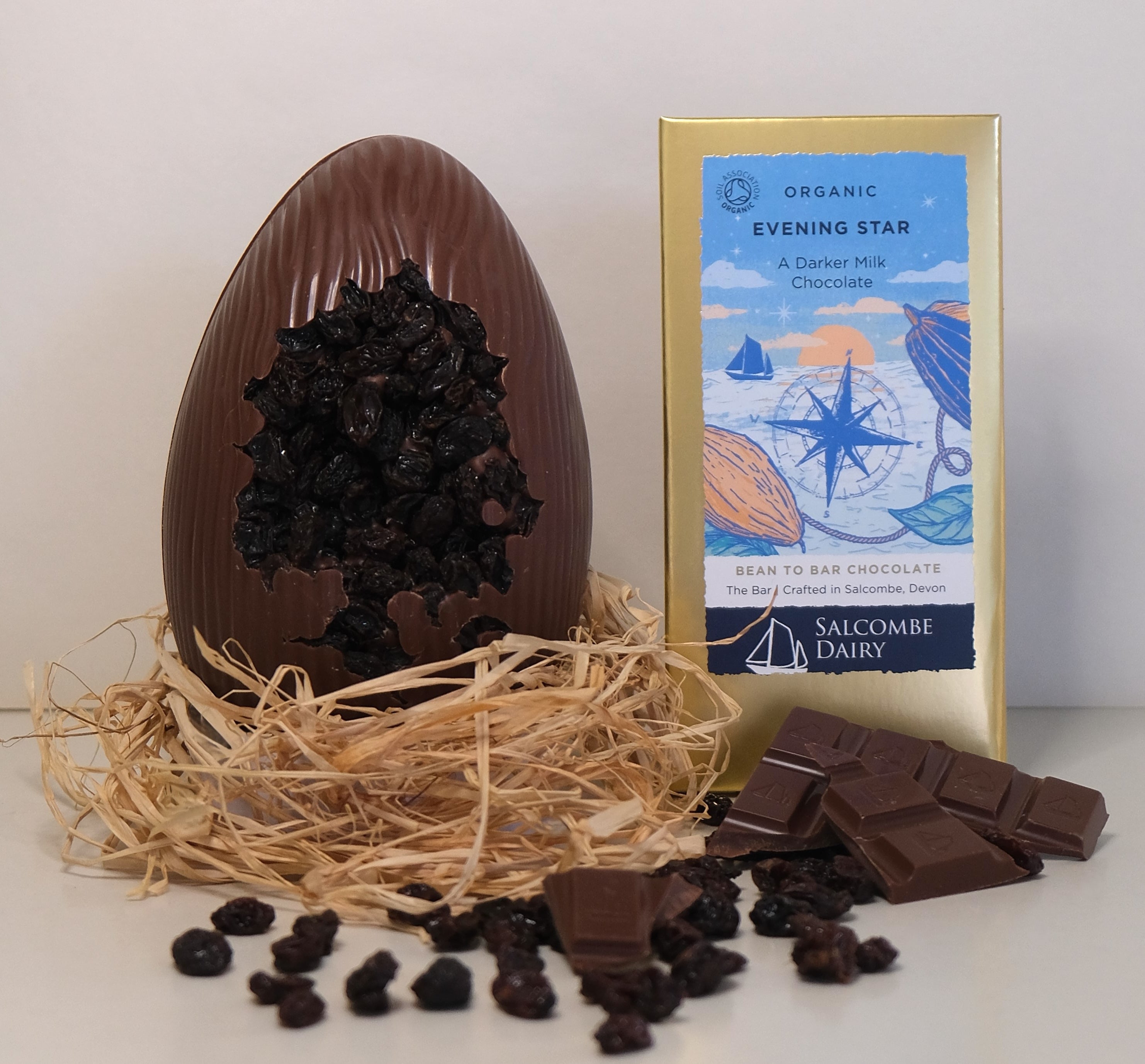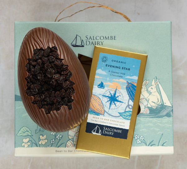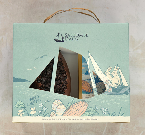 Our well-loved Rum and Raisin Easter Egg; a timeless and nostalgic choice. A balanced darker milk (54%) chocolate infused with the warm richness of rum and raisin. Featuring a generous cluster of plump rum-soaked raisins alongside a bar of our signature Evening Star chocolate, it’s a deliciously decadent pairing. Presented in a fully compostable and locally designed duck-egg-blue box with our signature yawl-shaped cutout and adorable nautical illustrations, this Easter treat is an indulgent nod to Salcombe’s seafaring heritage - best enjoyed with a view of the water.