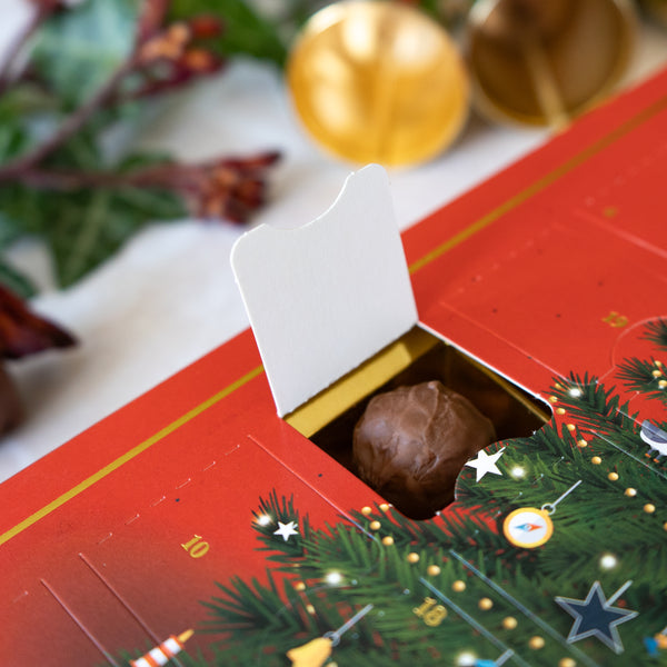 Behind each door, you will find a deliciously festive Christmas truffle, enrobed in bean-to-bar dark chocolate containing a sophisticated smooth ganache bursting with either mulled wine, sour cherry or Champagne.