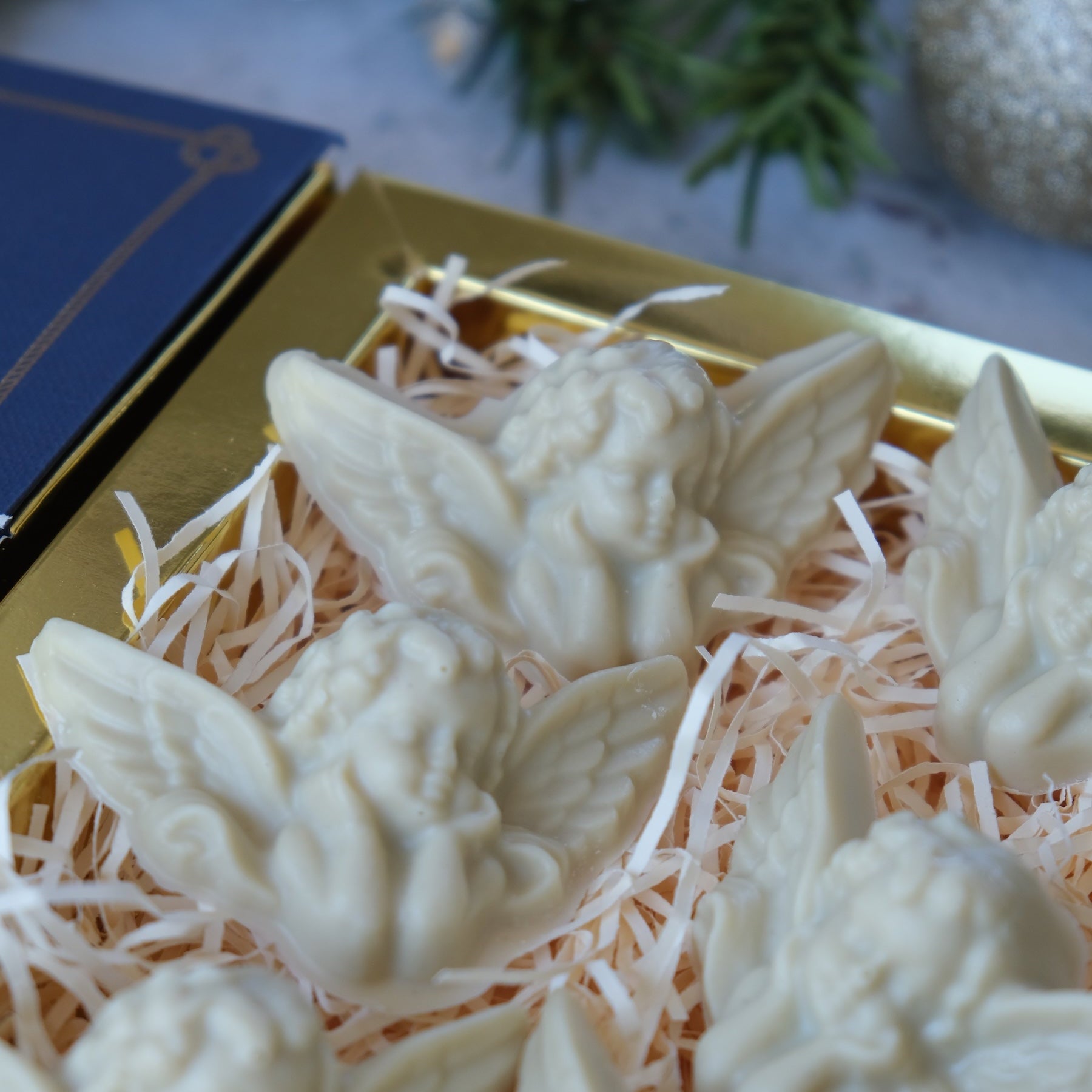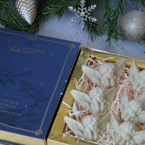 Crafted by our chocolatiers in Salcombe, these festive cherubs are made from our award winning bean-to-bar white chocolate, creating a wonderful treat this Christmas. Each cherub is moulded and presented in a beautifully designed navy book box, making it a thoughtful and elegant gift for anyone who deserves a little indulgence this Christmas. Also available in our milk chocolate.