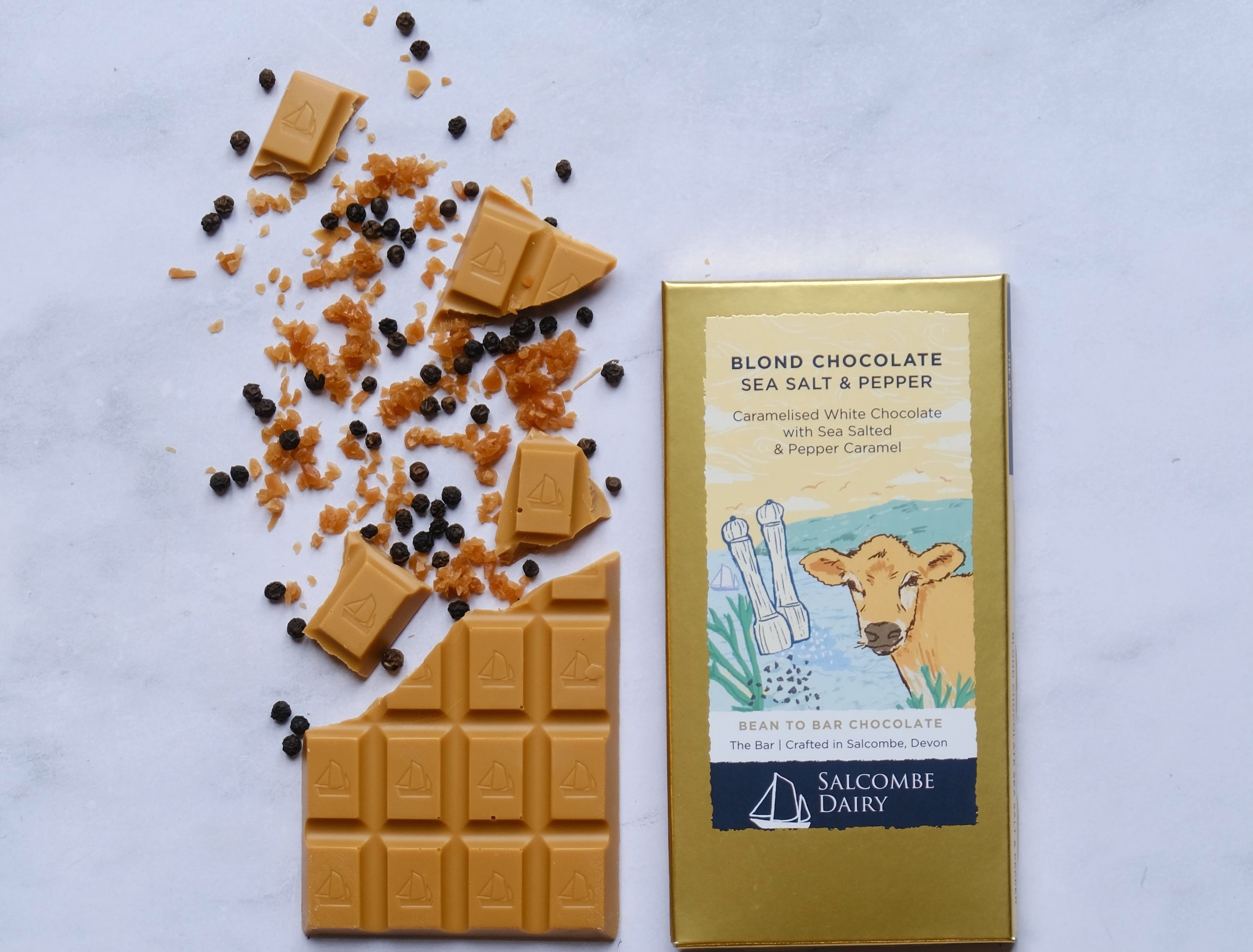 A daring twist on our much-loved Blond chocolate. This smooth, golden bar blends the rich, caramelised notes of biscuit and butterscotch with a subtle kick of cracked black pepper and a sprinkle of sea salt. The result is an intriguing balance of sweet and savoury, creamy, buttery, and beautifully moreish.